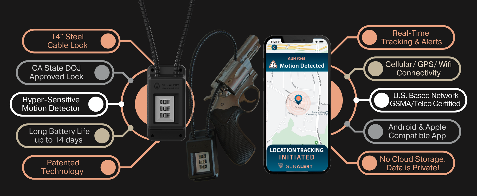 GunAlert® is a 3-in-1 solution combining a 14" cable lock, motion sensor, and GPS/Cellular locator to help responsible gun owners secure, monitor, and recover firearms via a convenient smartphone app.